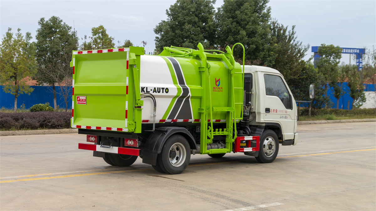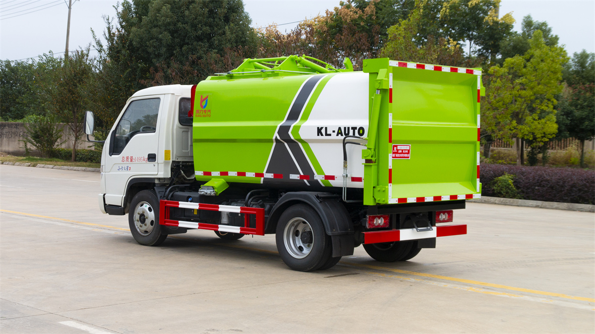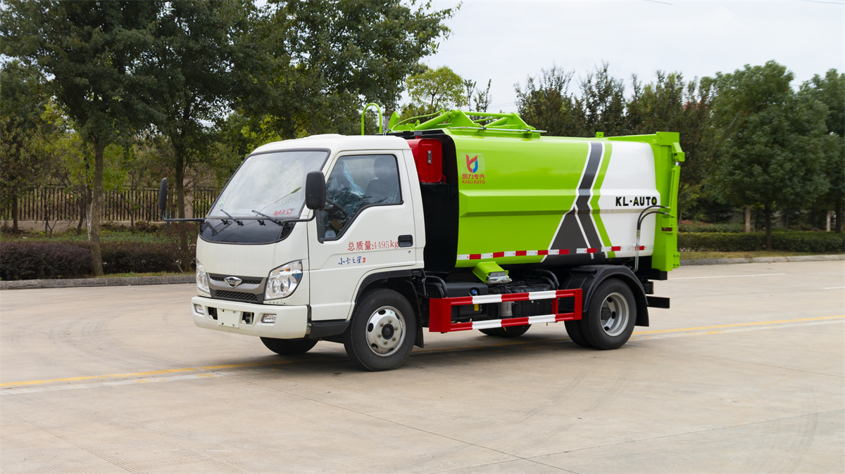 5方掛桶垃圾車-福田小卡3藍(lán)牌側(cè)裝壓縮掛桶垃圾車廠家