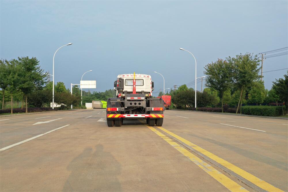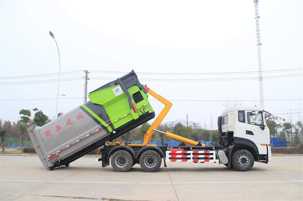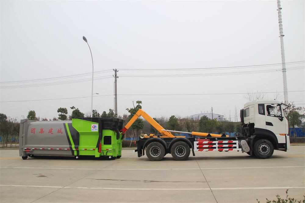 勾臂式垃圾車(車廂可卸式垃圾車)介紹: 車廂可卸式垃圾車又叫拉臂式垃圾車,是一種采用高新設(shè)計(jì)可伸縮的鉤臂,實(shí)現(xiàn)垃圾廂的二次吊裝,自吊上放下,可自行傾倒垃圾的環(huán)衛(wèi)設(shè)備。 拉臂式垃圾車結(jié)構(gòu)簡單,操作穩(wěn)定方便,裝卸效率高,機(jī)械化程度高,節(jié)省人力。鉤臂垃圾車一車可帶多個垃圾廂,在裝卸的運(yùn)輸過程中可有效地避免二次污染。 拉臂垃圾車采用高新設(shè)計(jì)可擺動的鉤臂,垃圾箱由框架、開啟油缸、滑輪、后門和若干加強(qiáng)框架與鋼板焊接而成。調(diào)換貨廂快捷方便,貨廂上帶蓋(倒垃圾時(shí)可翻開),鉤臂垃圾車?yán)鴰w可選用碳鋼、不銹鋼材質(zhì)、內(nèi)部采取環(huán)氧樹脂防腐處理,改裝部分與原車底盤為可分離式,維修方便且保持了原車的機(jī)動性及行駛性能。