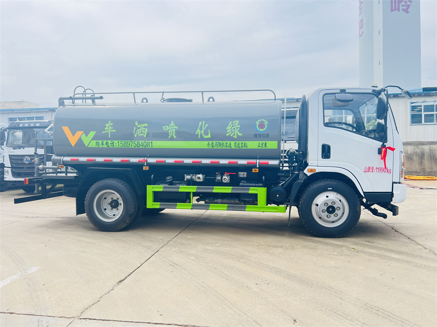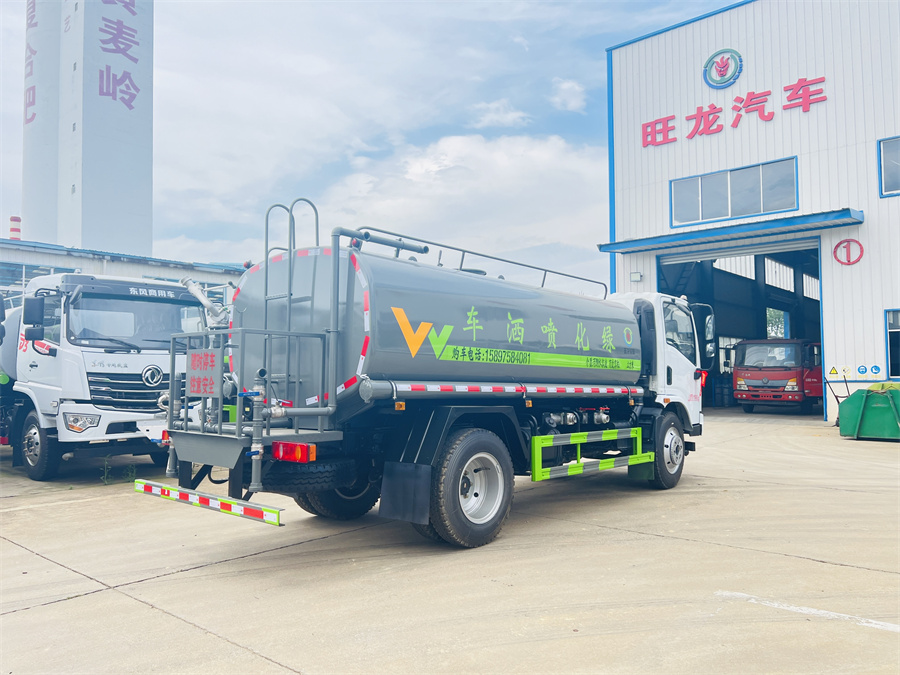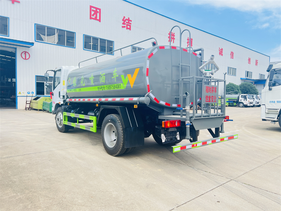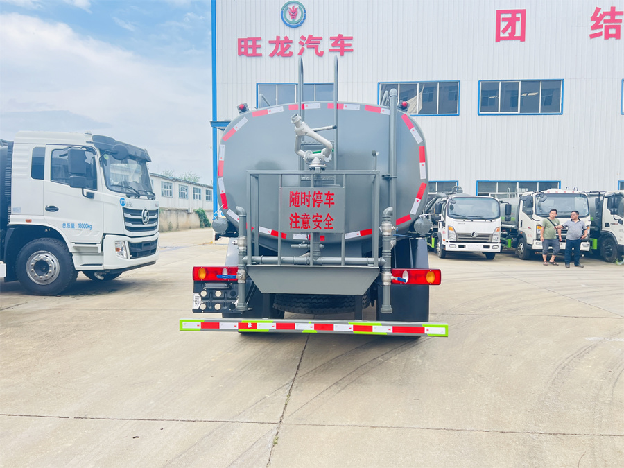 灑水車(chē)前裝有鴨形噴嘴或圓頭沖嘴,后面裝有圓柱開(kāi)灑水噴嘴或蓮蓬頭噴嘴,后部有一工作平臺(tái),裝配有水炮。后部還可裝8個(gè)噴嘴(選裝)。