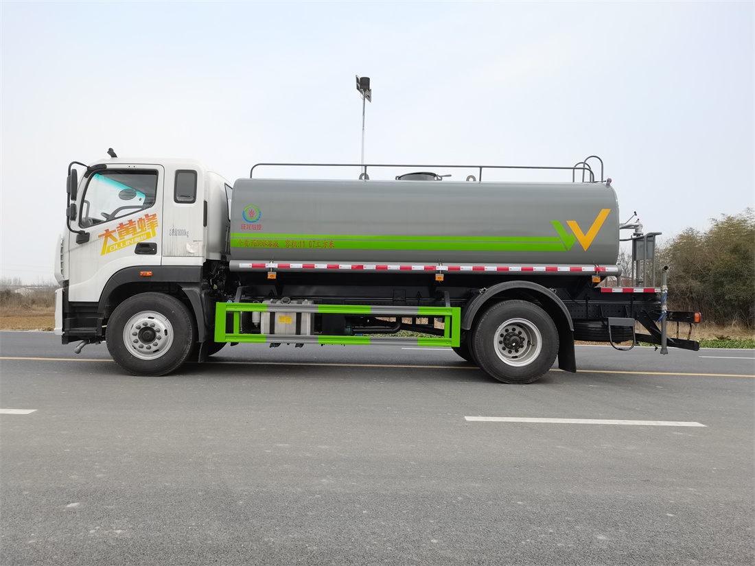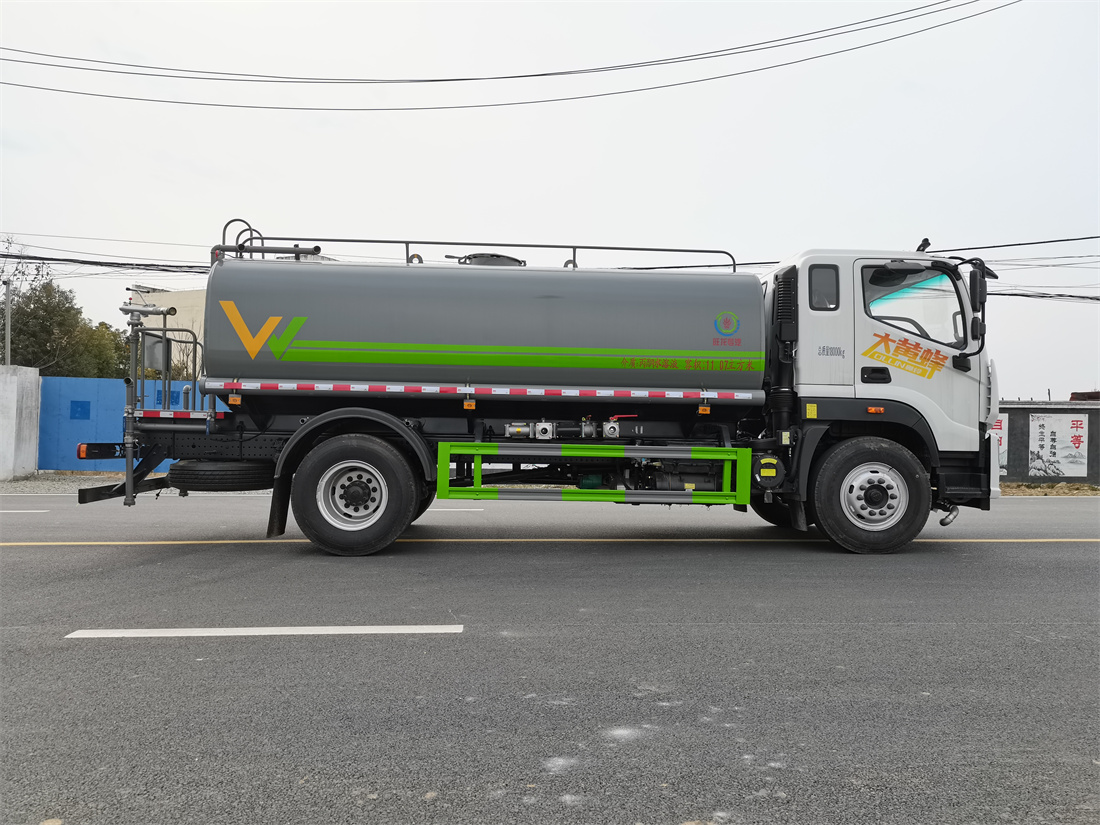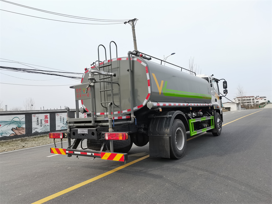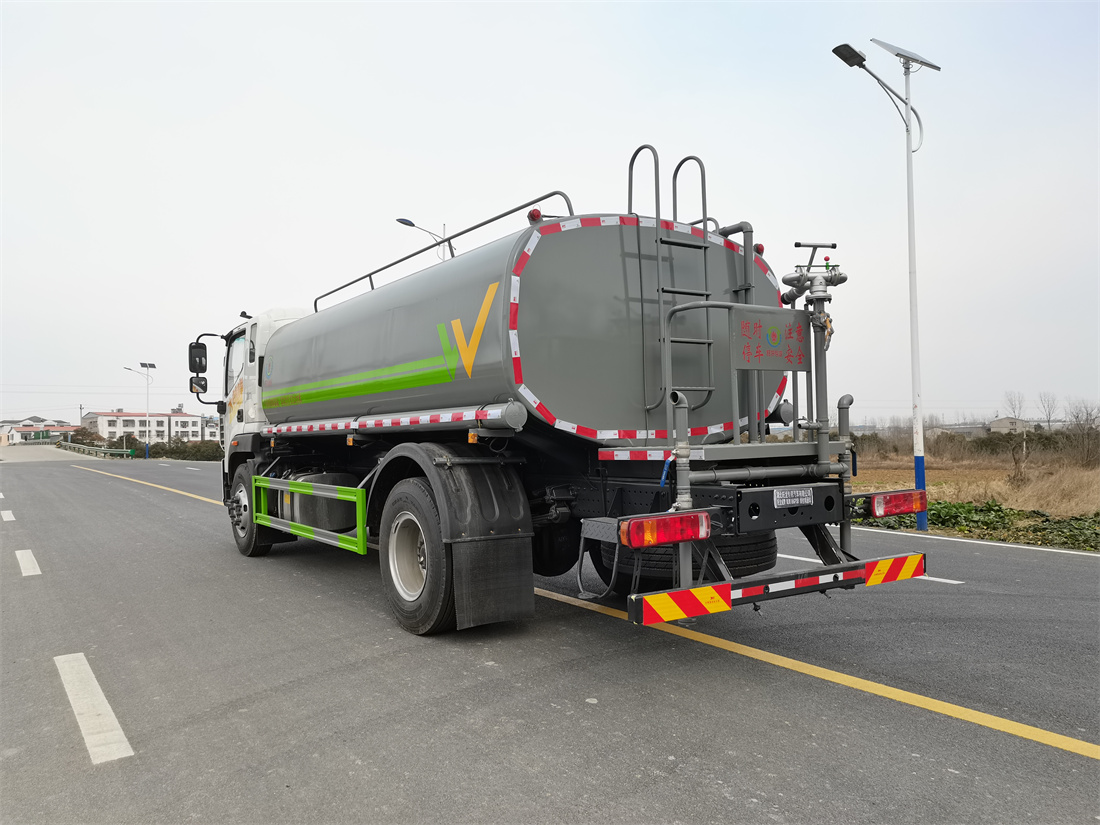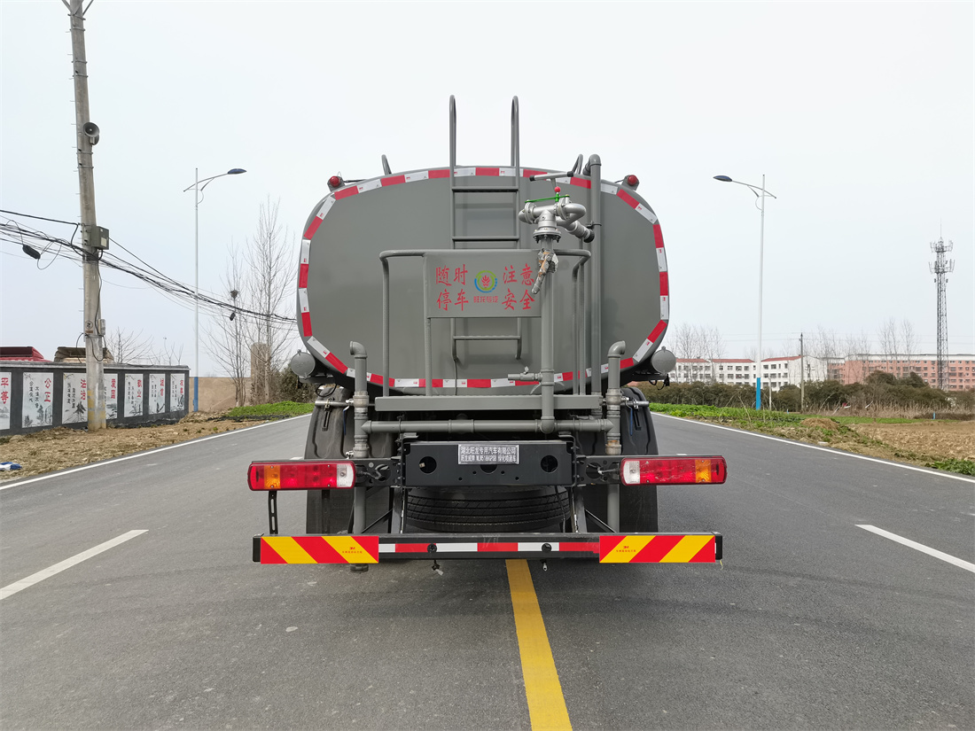 灑水車前裝有鴨形噴嘴或圓頭沖嘴,后面裝有圓柱開灑水噴嘴或蓮蓬頭噴嘴,后部有一工作平臺,裝配有水炮。后部還可裝8個噴嘴(選裝)。