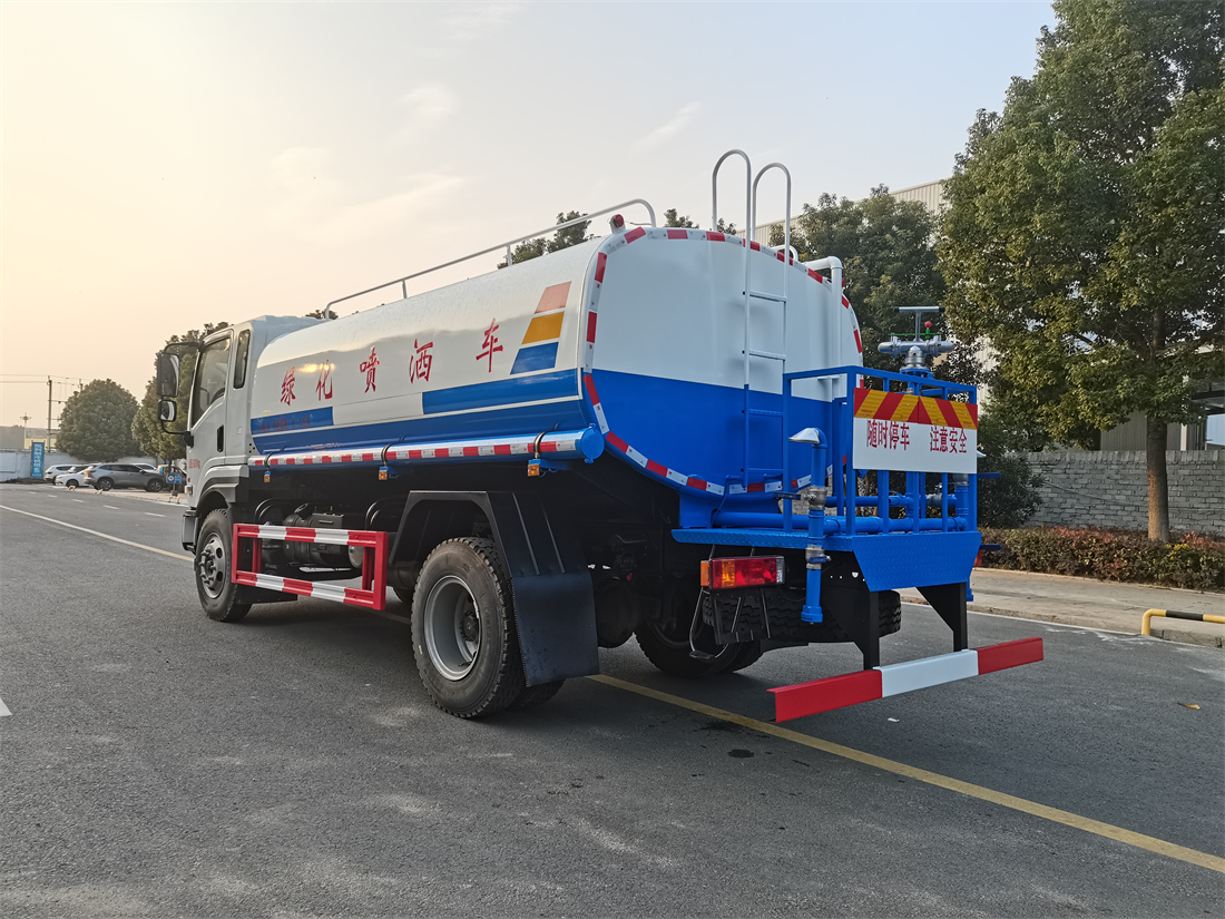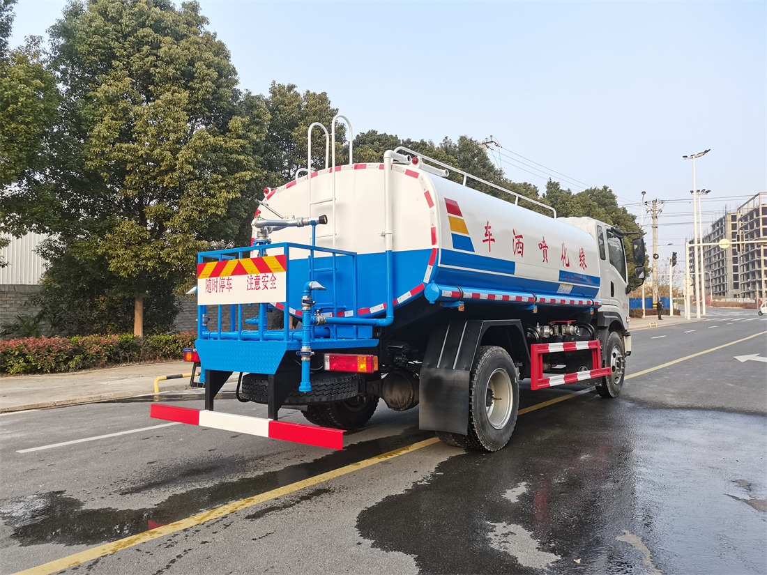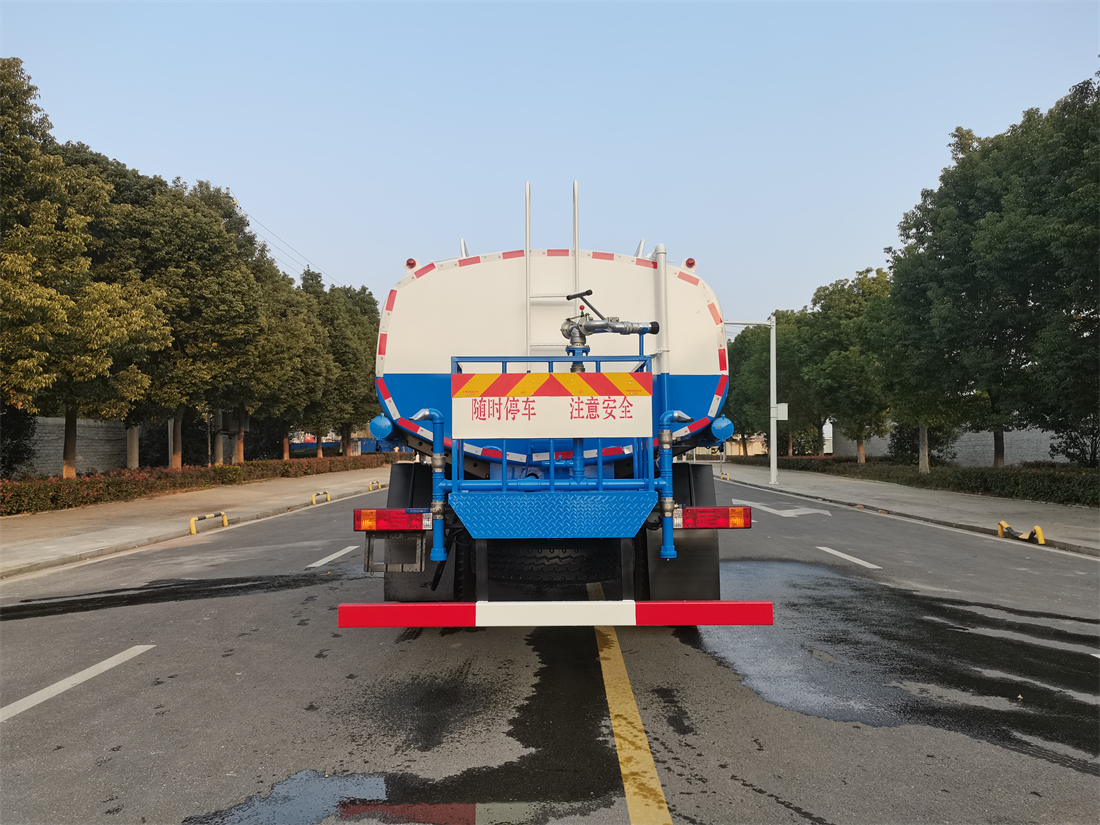 灑水車(chē)前裝有鴨形噴嘴或圓頭沖嘴,后面裝有圓柱開(kāi)灑水噴嘴或蓮蓬頭噴嘴,后部有一工作平臺(tái),裝配有水炮。后部還可裝8個(gè)噴嘴(選裝)。