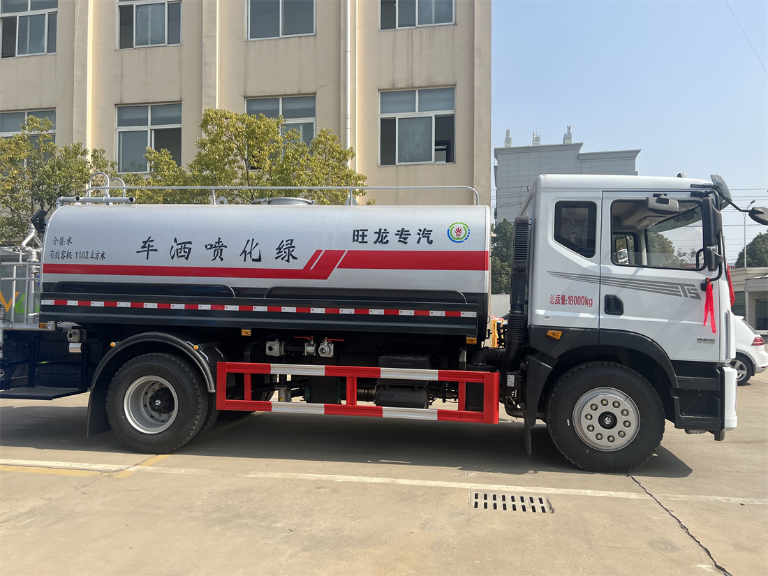 灑水車前裝有鴨形噴嘴或圓頭沖嘴,后面裝有圓柱開灑水噴嘴或蓮蓬頭噴嘴,后部有一工作平臺,裝配有水炮。后部還可裝8個噴嘴(選裝)。