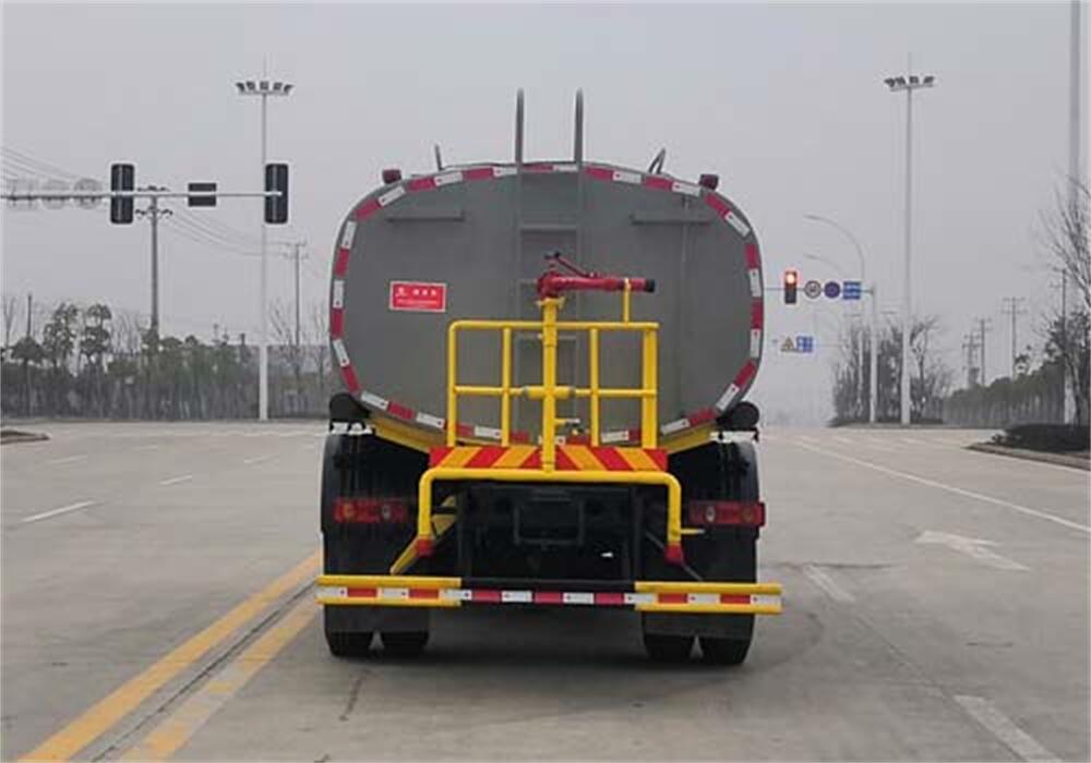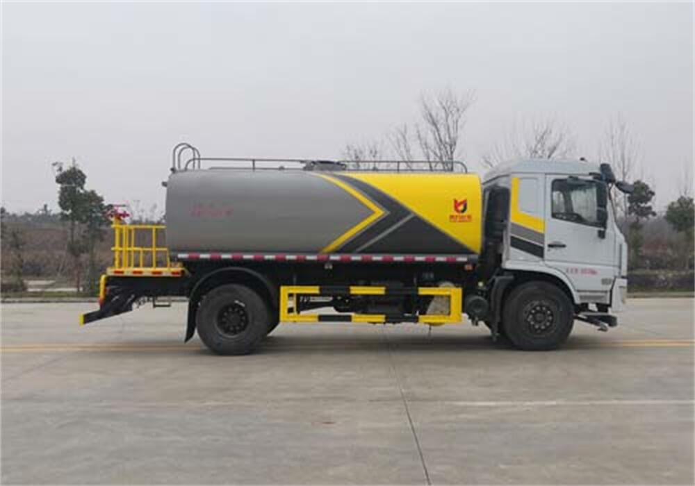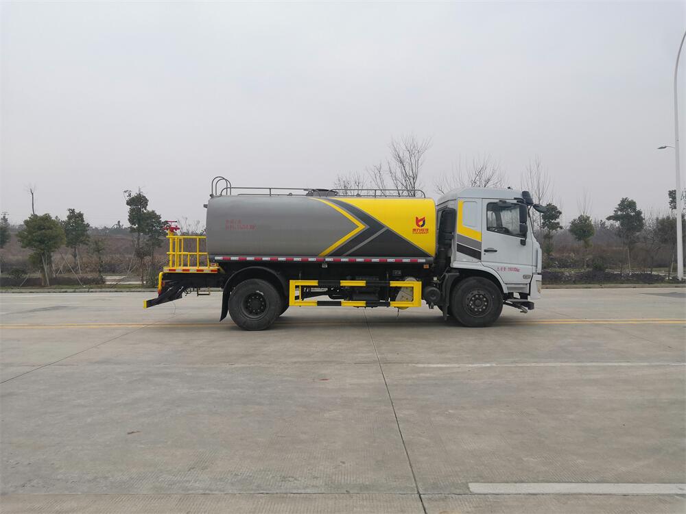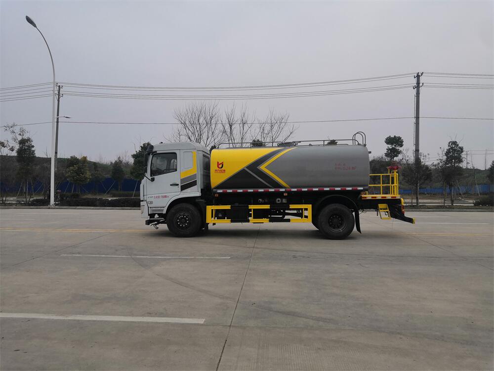 灑水車(chē)前裝有鴨形噴嘴或圓頭沖嘴,后面裝有圓柱開(kāi)灑水噴嘴或蓮蓬頭噴嘴,后部有一工作平臺(tái),裝配有水炮。后部還可裝8個(gè)噴嘴(選裝)。