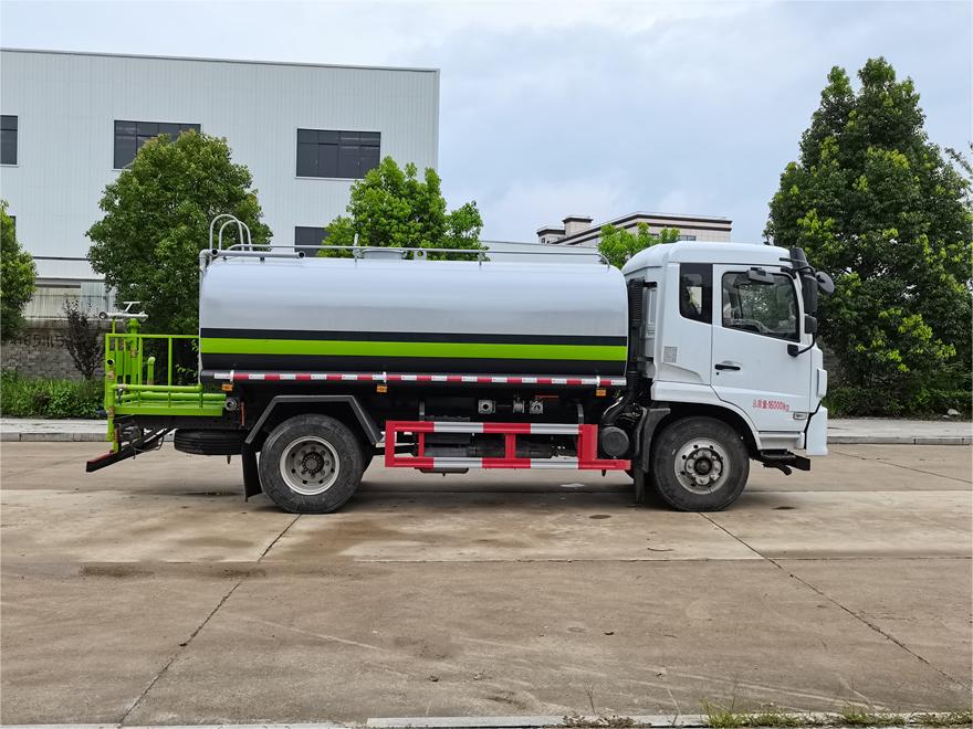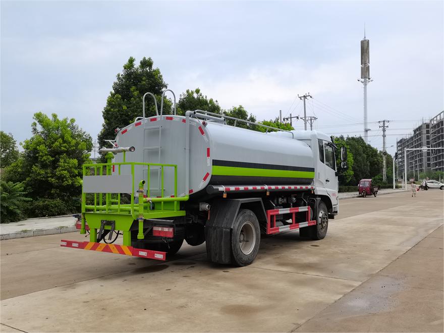 灑水車前裝有鴨形噴嘴或圓頭沖嘴,后面裝有圓柱開灑水噴嘴或蓮蓬頭噴嘴,后部有一工作平臺(tái),裝配有水炮。后部還可裝8個(gè)噴嘴(選裝)。