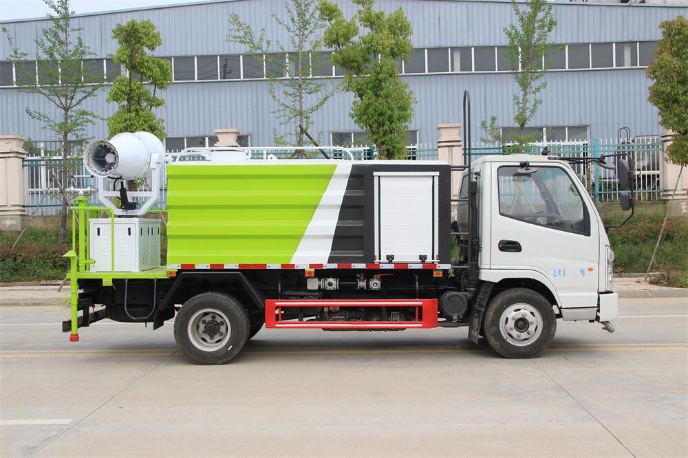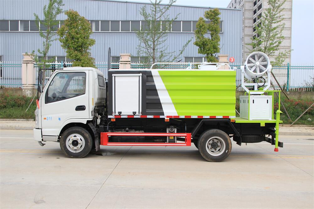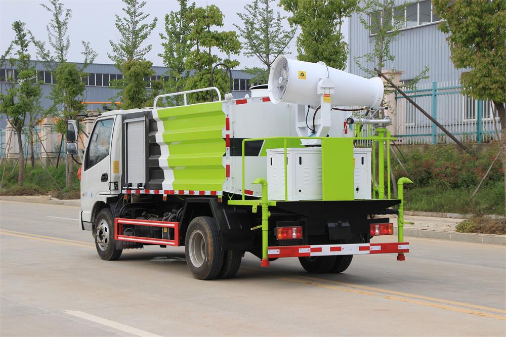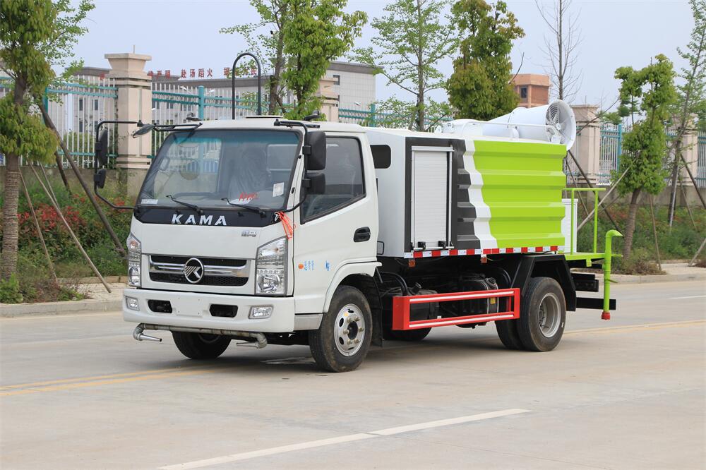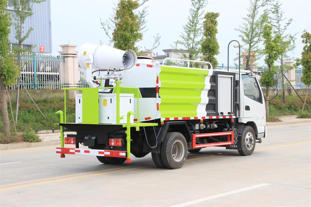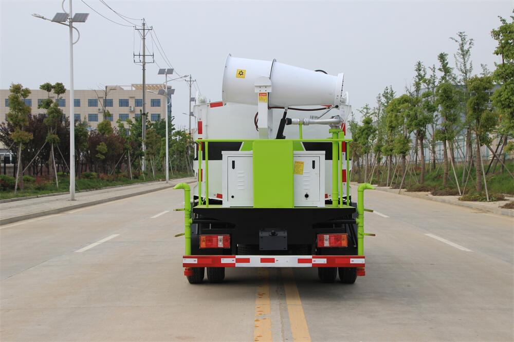 上裝配置:罐體容積為 5立方,選配風(fēng)送式霧炮機(jī)組射程30米、40米、50米、60米、80米、100米、120米霧炮,罐體鋼板為4mm碳鋼Q235材質(zhì),罐內(nèi)隔板具有防波作用,以減輕汽車行駛時(shí)罐體液體沖擊,罐體及整車外形尺寸按照公告。帶大功率專用灑水泵,泵可自吸自排,整車前沖、后灑、側(cè)噴、帶65消防接口,后平臺(tái)配CLW-50、CLW-60、CLW-80、CLW-100、CLW-120型風(fēng)送式霧炮機(jī)組;罐體前封頭配大功率柴油發(fā)電機(jī)組;前封頭帶水位計(jì),后平臺(tái)主管路帶1寸澆花接口,后爬梯。帶兩根輸水管及陰陽(yáng)端。罐體顏色:銀/灰/綠,罐體兩側(cè)噴“多功能抑塵車”字樣,貼反光標(biāo)示。