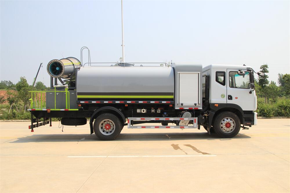 上裝配置:罐體容積為 12立方,選配風(fēng)送式霧炮機(jī)組射程30米、40米、50米、60米、80米、100米、120米霧炮,罐體鋼板為4mm碳鋼Q235材質(zhì),罐內(nèi)隔板具有防波作用,以減輕汽車行駛時(shí)罐體液體沖擊,罐體及整車外形尺寸按照公告。帶大功率專用灑水泵,泵可自吸自排,整車前沖、后灑、側(cè)噴、帶65消防接口,后平臺(tái)配CLW-50、CLW-60、CLW-80、CLW-100、CLW-120型風(fēng)送式霧炮機(jī)組;罐體前封頭配大功率柴油發(fā)電機(jī)組;前封頭帶水位計(jì),后平臺(tái)主管路帶1寸澆花接口,后爬梯。帶兩根輸水管及陰陽端。罐體顏色:銀/灰/綠,罐體兩側(cè)噴“多功能抑塵車”字樣,貼反光標(biāo)示。