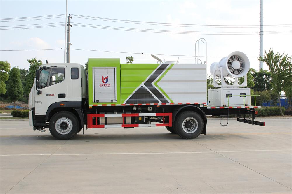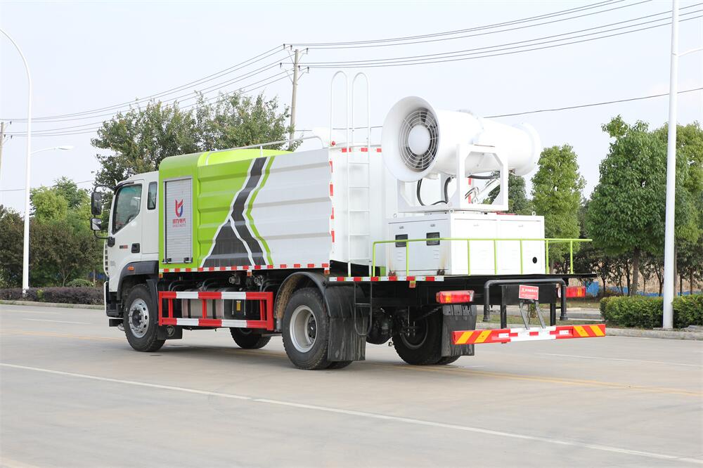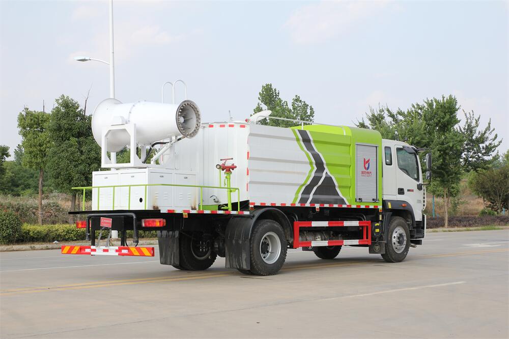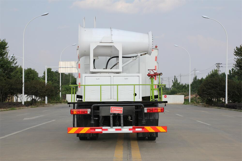 上裝配置:罐體容積為 12立方,選配風(fēng)送式霧炮機(jī)組射程30米、40米、50米、60米、80米、100米、120米霧炮,罐體鋼板為4mm碳鋼Q235材質(zhì),罐內(nèi)隔板具有防波作用,以減輕汽車(chē)行駛時(shí)罐體液體沖擊,罐體及整車(chē)外形尺寸按照公告。帶大功率專(zhuān)用灑水泵,泵可自吸自排,整車(chē)前沖、后灑、側(cè)噴、帶65消防接口,后平臺(tái)配CLW-50、CLW-60、CLW-80、CLW-100、CLW-120型風(fēng)送式霧炮機(jī)組;罐體前封頭配大功率柴油發(fā)電機(jī)組;前封頭帶水位計(jì),后平臺(tái)主管路帶1寸澆花接口,后爬梯。帶兩根輸水管及陰陽(yáng)端。罐體顏色:銀/灰/綠,罐體兩側(cè)噴“多功能抑塵車(chē)”字樣,貼反光標(biāo)示。