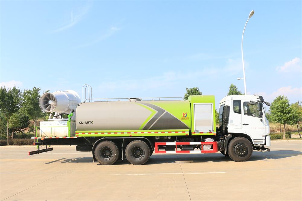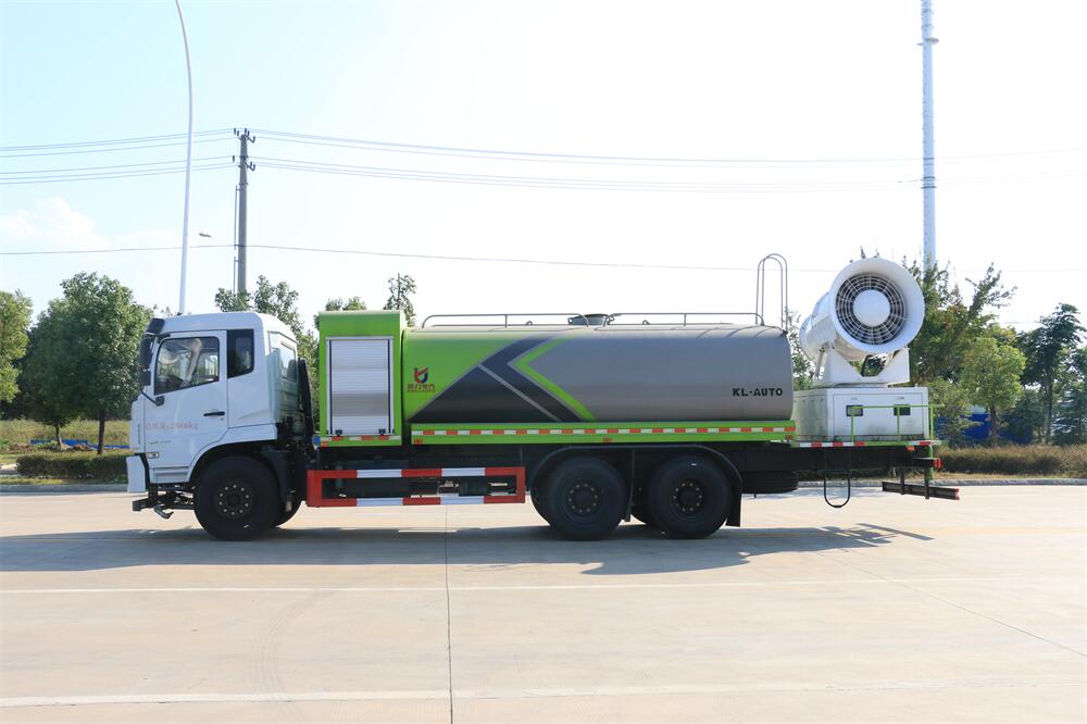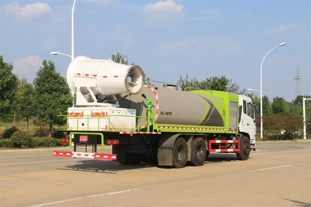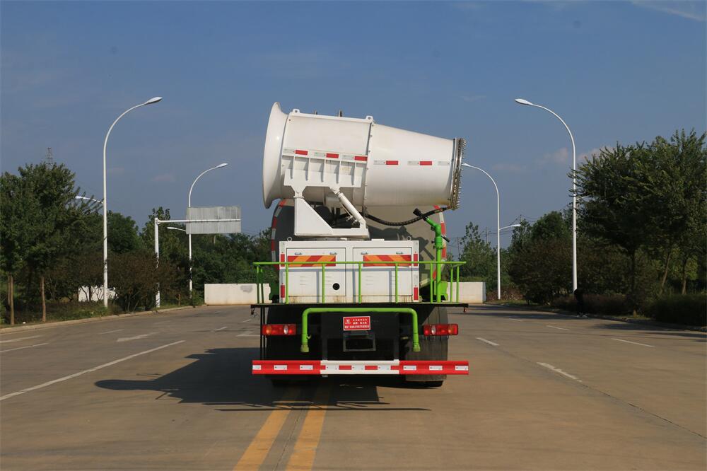 上裝配置:罐體容積為 16立方,選配風送式霧炮機組射程30米、40米、50米、60米、80米、100米、120米霧炮,罐體鋼板為4mm碳鋼Q235材質(zhì),罐內(nèi)隔板具有防波作用,以減輕汽車行駛時罐體液體沖擊,罐體及整車外形尺寸按照公告。帶大功率專用灑水泵,泵可自吸自排,整車前沖、后灑、側(cè)噴、帶65消防接口,后平臺配CLW-50、CLW-60、CLW-80、CLW-100、CLW-120型風送式霧炮機組;罐體前封頭配大功率柴油發(fā)電機組;前封頭帶水位計,后平臺主管路帶1寸澆花接口,后爬梯。帶兩根輸水管及陰陽端。罐體顏色:銀/灰/綠,罐體兩側(cè)噴“多功能抑塵車”字樣,貼反光標示。