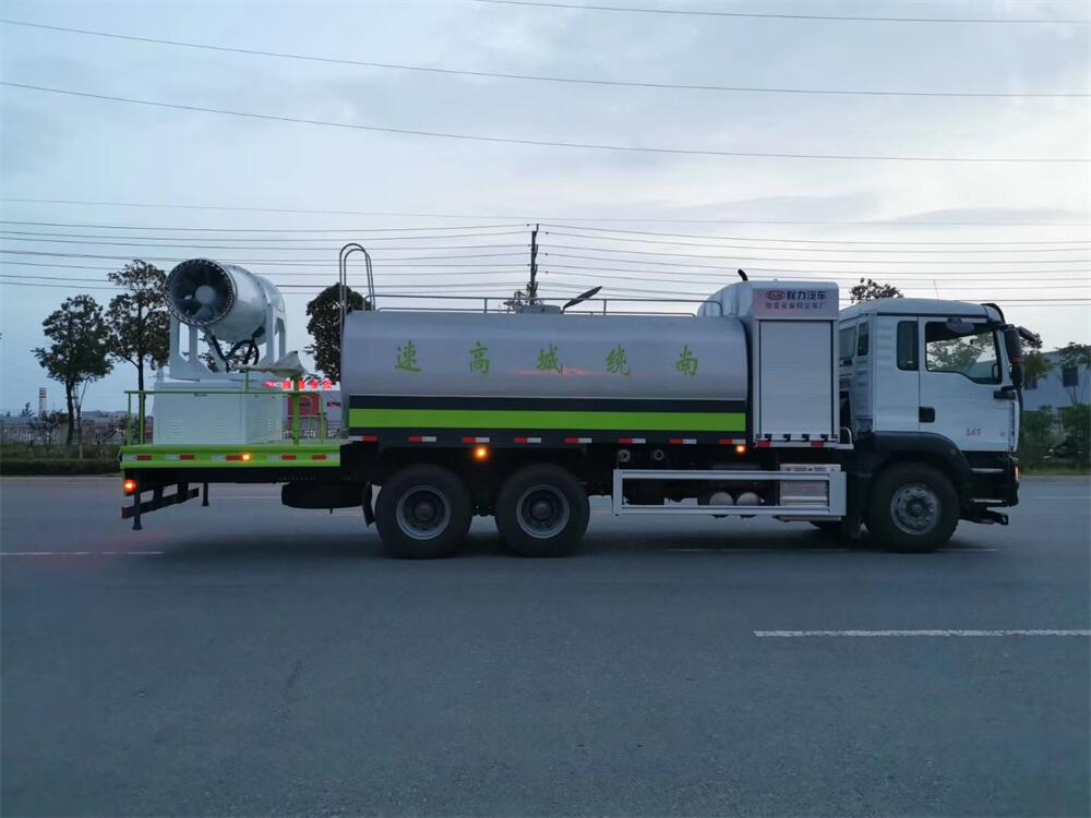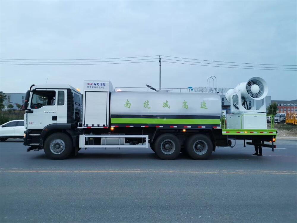 上裝配置:罐體容積為 16立方,選配風送式霧炮機組射程30米、40米、50米、60米、80米、100米、120米霧炮,罐體鋼板為4mm碳鋼Q235材質(zhì),罐內(nèi)隔板具有防波作用,以減輕汽車行駛時罐體液體沖擊,罐體及整車外形尺寸按照公告。帶大功率專用灑水泵,泵可自吸自排,整車前沖、后灑、側(cè)噴、帶65消防接口,后平臺配CLW-50、CLW-60、CLW-80、CLW-100、CLW-120型風送式霧炮機組;罐體前封頭配大功率柴油發(fā)電機組;前封頭帶水位計,后平臺主管路帶1寸澆花接口,后爬梯。帶兩根輸水管及陰陽端。罐體顏色:銀/灰/綠,罐體兩側(cè)噴“多功能抑塵車”字樣,貼反光標示。