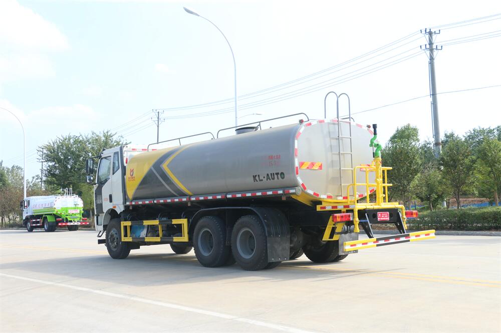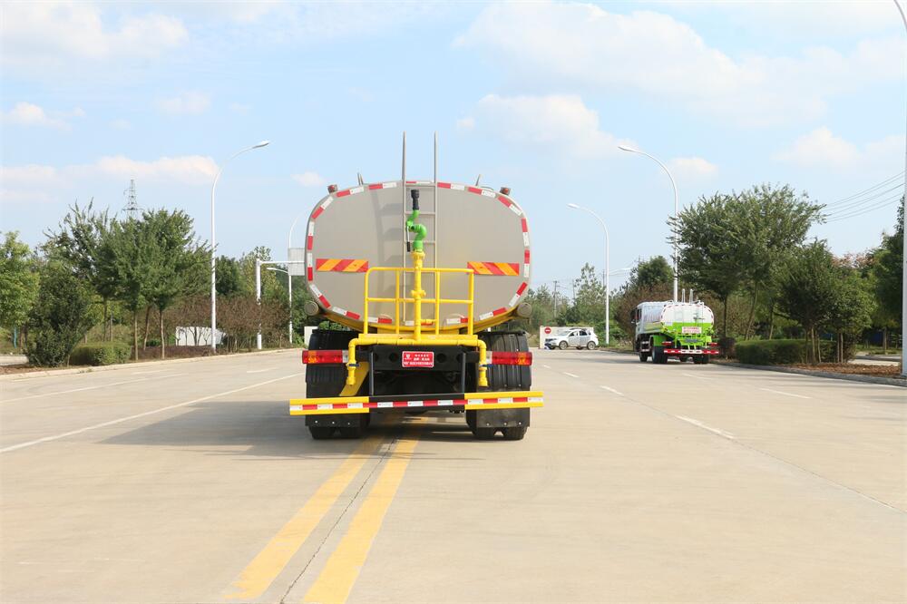 灑水車前裝有鴨形噴嘴或圓頭沖嘴,后面裝有圓柱開(kāi)灑水噴嘴或蓮蓬頭噴嘴,后部有一工作平臺(tái),裝配有水炮。后部還可裝8個(gè)噴嘴(選裝)。